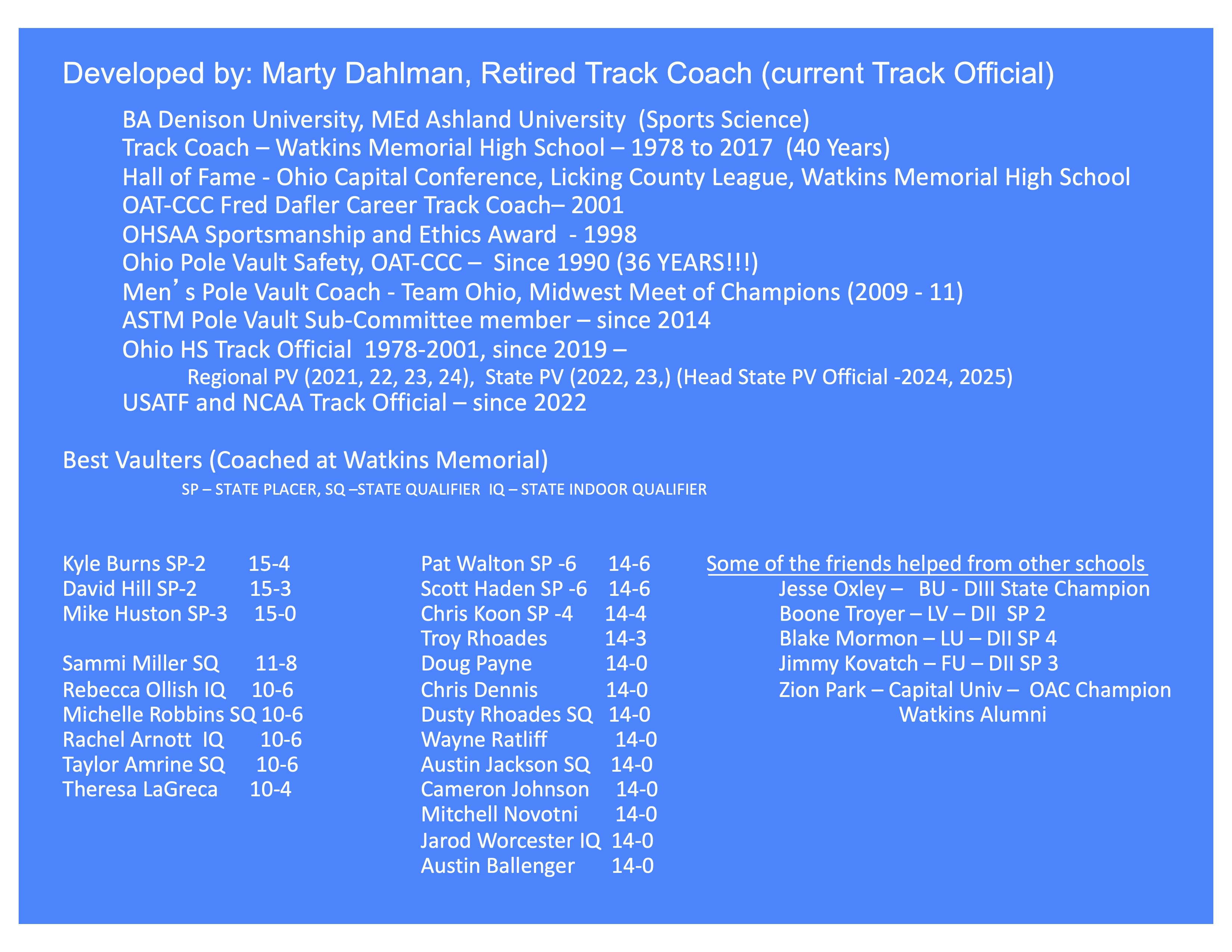 I’ve coached pole vault here in Ohio since 1982. In 1990 I was a member of the Ohio Coaches Association Committee that developed a series of clinics to improve pole vault coaching and safety. In 2001, Ohio became one of the first states to require Pole Vault Safety Certification to coach Middle School or High School Pole Vault. I’ve been conducting PV Safety Clinics for the Coaches Association ever since.